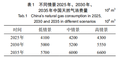 (1)研究认为,在不发生大规模战争的情况下,“十四五”期间中国天然气消费量年均增长 率仍将在5%以 上, 中 情 景 下2025年消费量达4 200×108 m 3,2035年可达6 000×108 m 3 以 上。