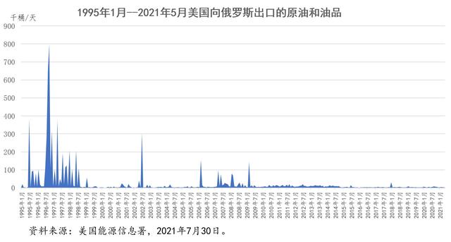 从2000年1月开始至今的大部分时间里,除少数月份外,美国向俄罗斯出口的石油,都少于1万桶/天,期间从2015年1月至2021年5月间,除2015年7月为1.5万桶/天和2018年1月为3万桶/天之外,都仅仅维持在数千桶/天的非常低的水平。