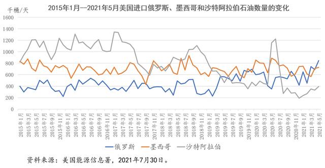 从2004年1月开始,除2004年1月至3月的3个月时间里低于20万桶/天外,美国从俄罗斯进口石油的数量都在每天20万桶之上,2004年1月至2021年5月月均进口数量为45.5万桶/天,而且从2019年1月开始呈逐月走高的势头。
