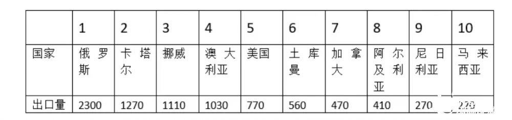 从上表可知,世界上天然气出口量超过1000亿立方米的国家只有4个,超过2000亿立方米的国家仅有俄罗斯一个。